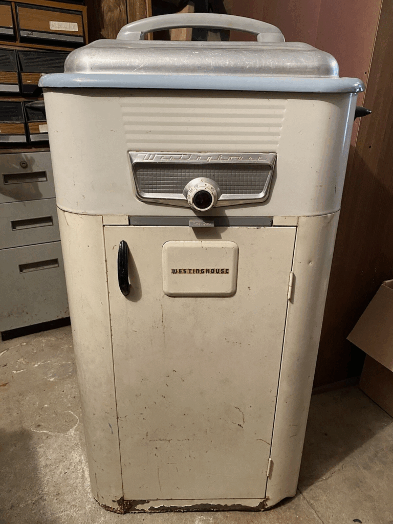 The Westinghouse roaster from the 1950s helped families cook large meals. It roasted turkey, ham, and vegetables evenly. The removable pan made serving easier. Many homes used it during holiday gatherings. Clean units often reach $70 to $150.