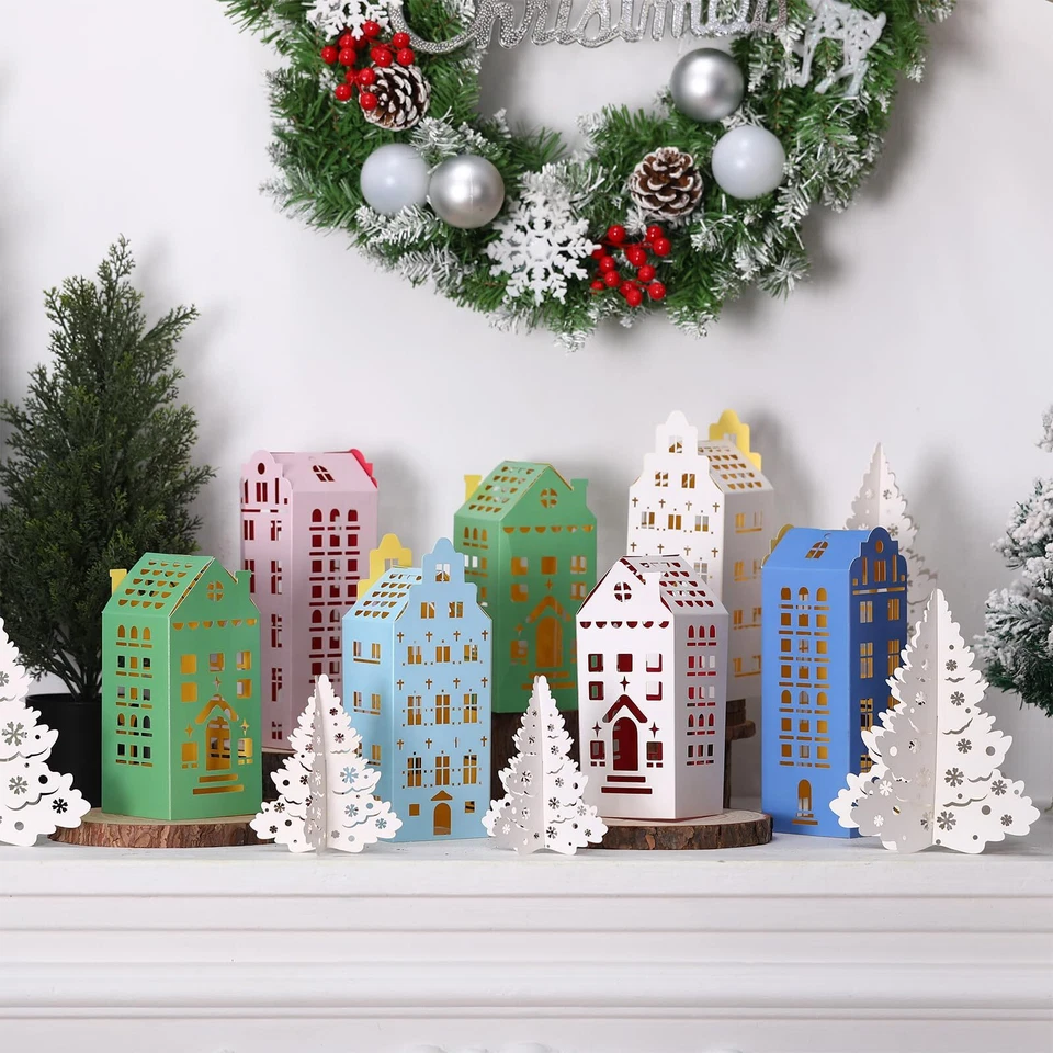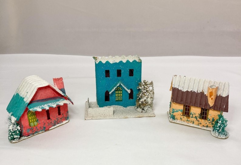 Before porcelain and ceramic villages, paper putz houses , small cardboard or paper buildings , were popular holiday decor pieces in the early to mid-20th century. These little houses had simple designs, with pitched roofs and sometimes glitter or faux-snow details, giving them a charming, old-fashioned look. Displaying a collection of these on a mantel, shelf, or windowsill brings a retro holiday character into your home, often evoking nostalgia from generations past. Because they are lightweight and easy to arrange, they make great seasonal decor that can be stored and reused each year. Many collectors value authentic mid-century putz houses for their handmade, sentimental quality.