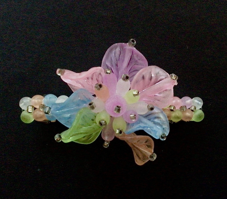 Such slides were often used to decorate half-up hairstyles or to clip small sections of hair in playful styles. Because Lucite retains clarity relatively well if treated properly, these pieces can remain attractive decades later. When seeking one, look at the edges of the Lucite for signs of chipping or clouding. The flower motif gives it decorative appeal beyond pure functionality.
