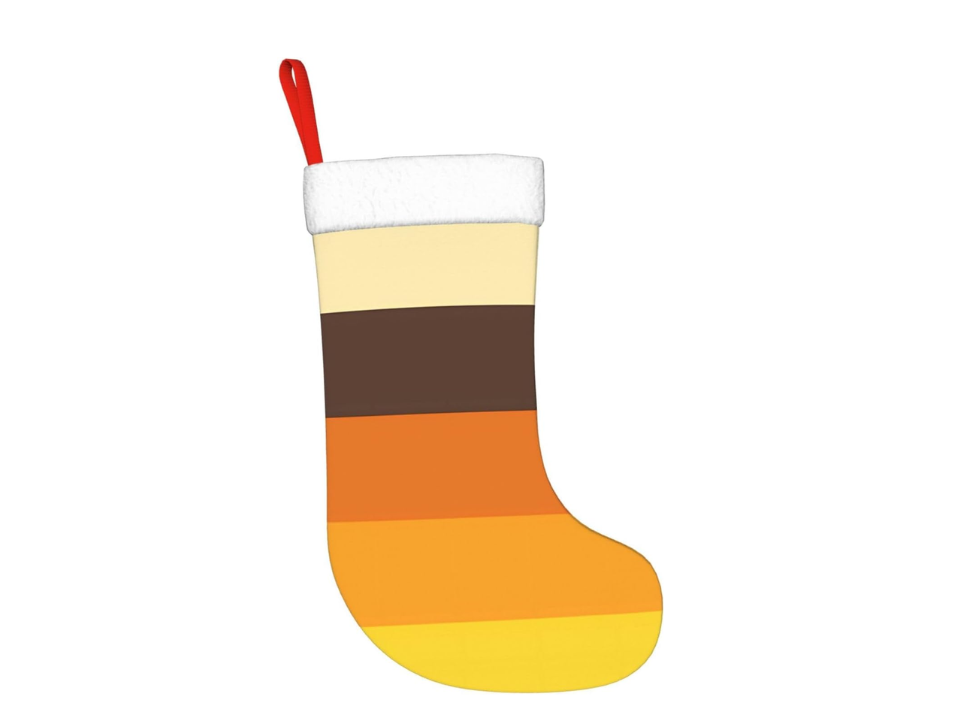 In the 1970s some stockings embraced more playful color schemes and striped patterns rather than traditional red and white. Materials include brushed polyester or synthetic fabrics. The stripes may combine greens, browns, oranges or other period‑style colors that reflect holiday décor of that era.