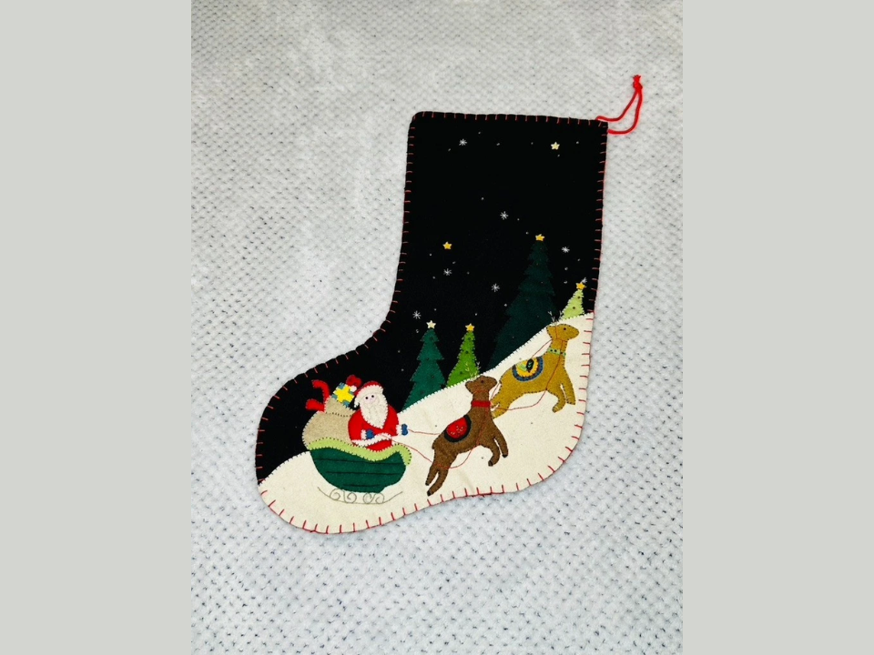 This style often uses thick red felt for the body and white felt or fabric for trim. Embroidery work depicts Santa Claus, reindeer, sleigh or winter scenes. Because felt resists fraying, these stockings can survive many decades if kept away from humidity. Older examples may show slight fading or softening of colors but that lends a nostalgic charm.