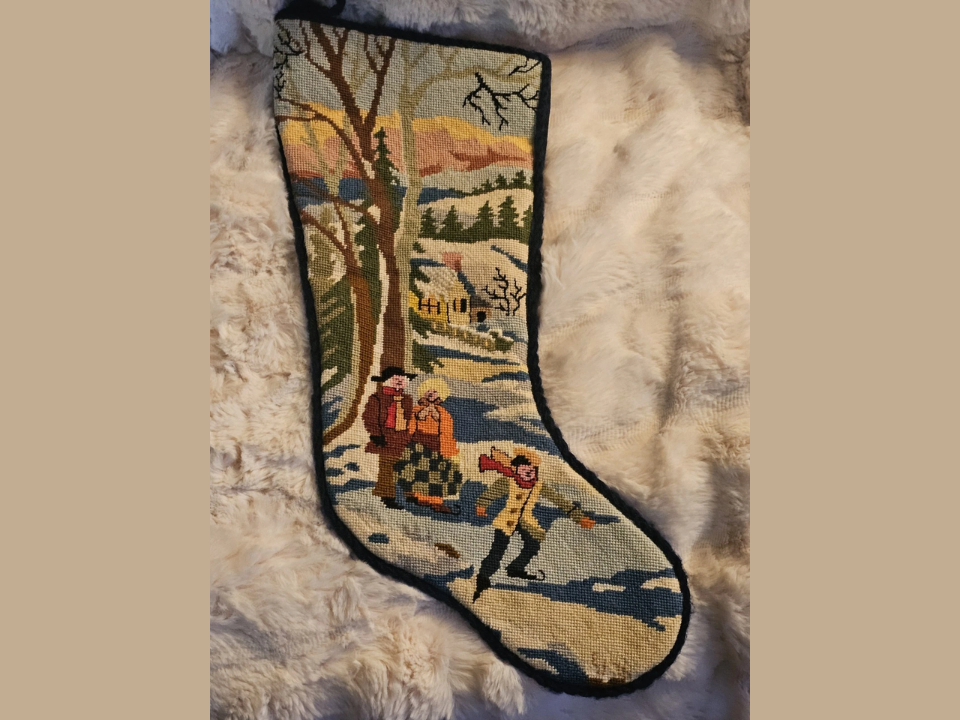 Needlepoint or Tapestry‑Style Stocking with Holiday Scene