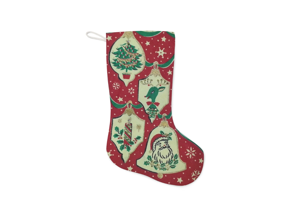 Some mid‑century stockings used cotton fabric printed with toy motifs, candy canes, gifts, holly, or reindeer as part of holiday decor. These prints may fade slightly with time, but often maintain the outlines of toys or gifts. They evoke a playful holiday atmosphere that reflects how families used to fill stockings with simple toys or treats. F