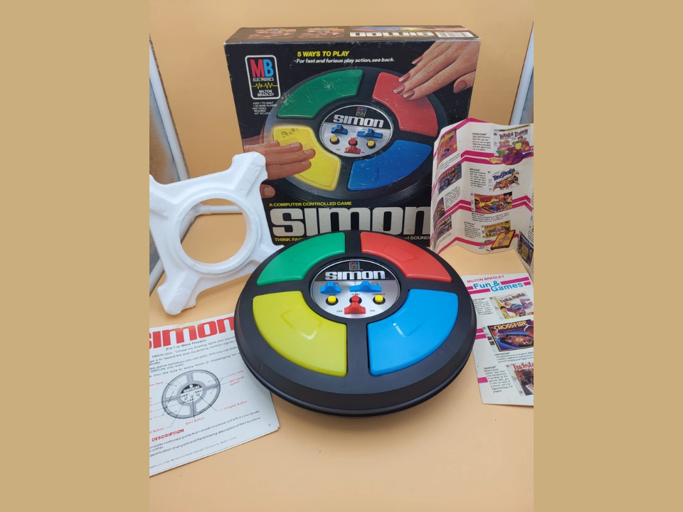 The Simon game is a memory and rhythm based electronic toy that uses colored lights and tones. Players must watch the sequence and repeat it back as it grows longer with each turn. This simple challenge was thrilling and sometimes maddening in happy ways. People of all ages played it and tried to beat each other in sequence length.