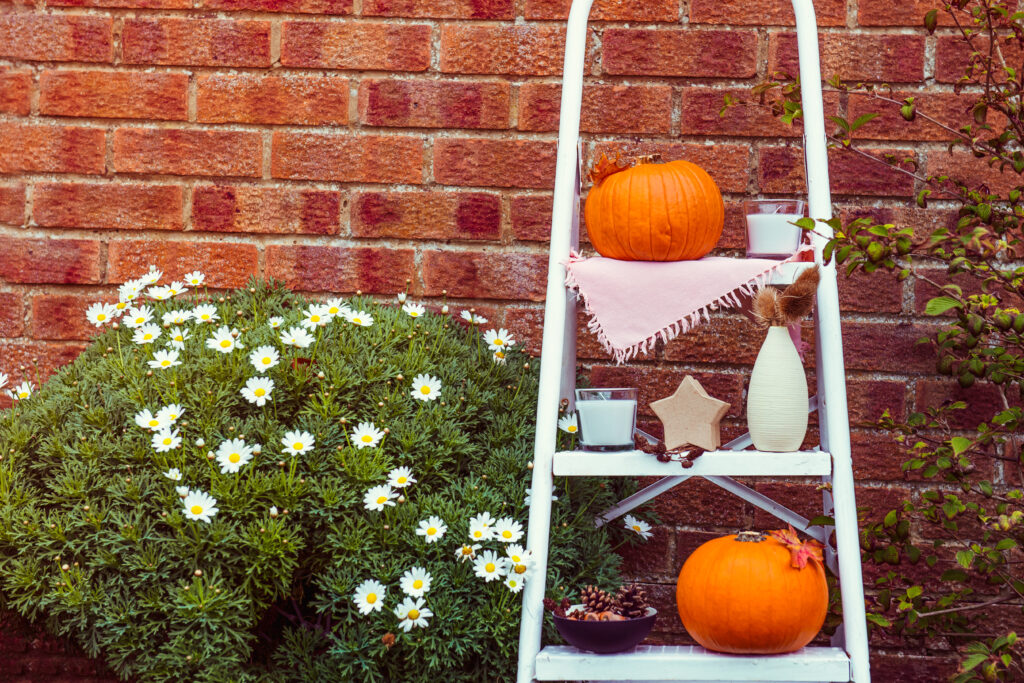 A rustic wooden ladder is perfect for showing off fall decor. Lean it against your porch wall and fill each step with a mix of pumpkins, hay tufts, and dried corn. You can even add a few small lanterns or leaf garlands for more texture. The height draws the eye upward and adds balance to wider displays.