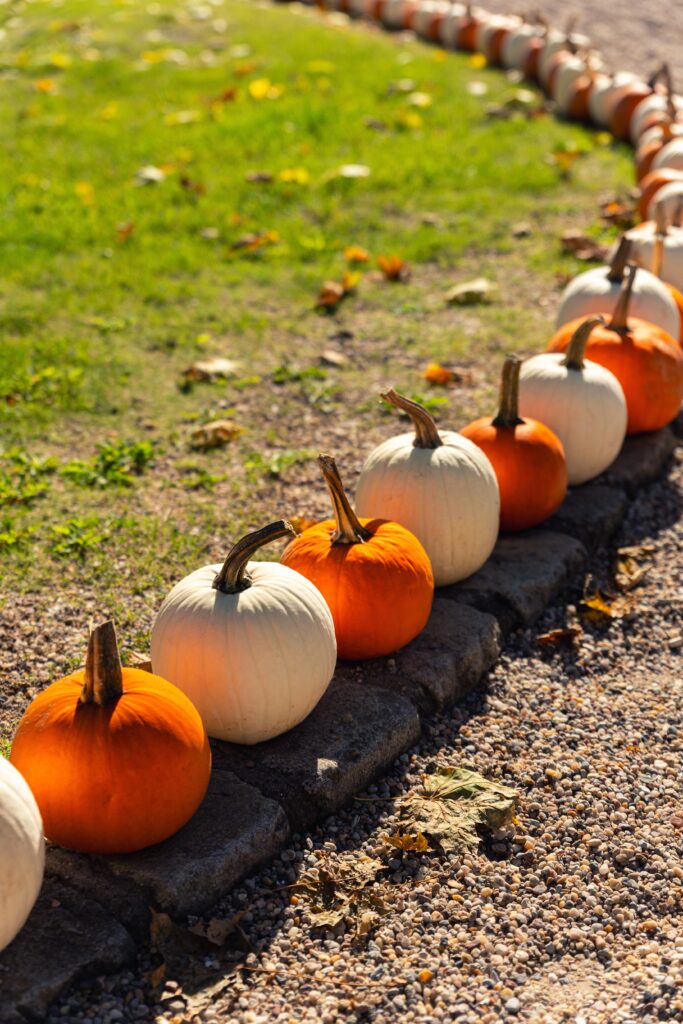 Line your walkway with pumpkins set on small pads of hay for a cozy glow-up. Use a mix of tall and round pumpkins to make the path feel natural. For evening charm, place solar lanterns or mason jars with tea lights between them. The warm light bouncing off the pumpkins creates a soft golden path.