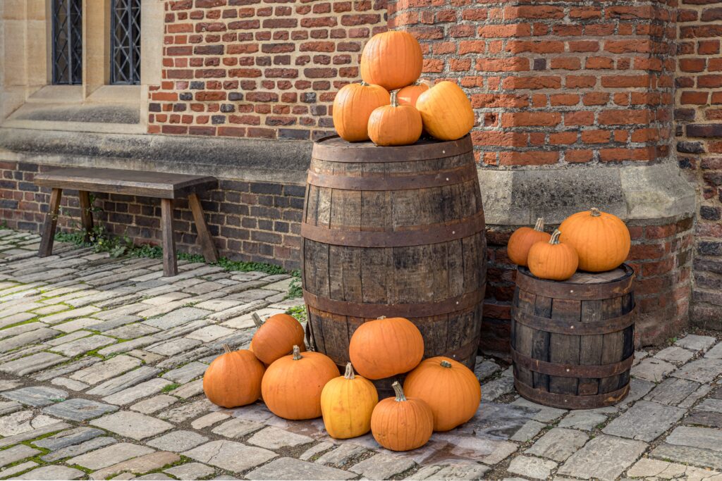 Stacking wooden barrels or half-barrels adds height and charm to your outdoor setup. Fill the top layer with hay and nestle pumpkins in different sizes inside. You can tuck a few dried cornstalk leaves between them for a fuller look. Place this near an entryway or along a garden path for a farmhouse effect.