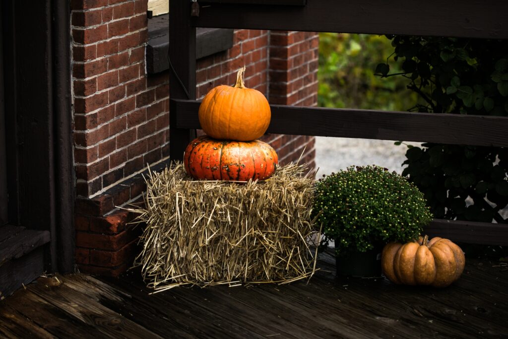 Turn your front porch into a welcoming harvest nook with hay bales and pumpkins. Stack a few bales near your door, then top them with gourds and a wooden crate. Add a galvanized bucket filled with cornstalks or dried flowers for height. It’s an easy way to make your entry look festive without feeling crowded.