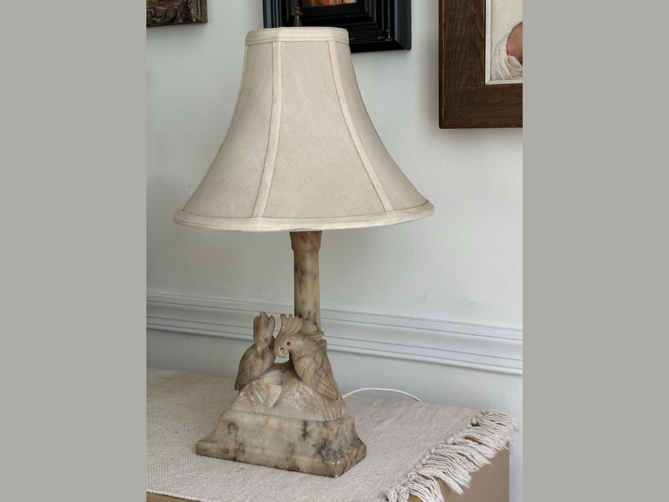 This vintage carved alabaster lamp features a bird motif, highlighting the natural beauty of the material and the subject. The lamp’s soft, diffused light enhances the intricate carvings, creating a serene ambiance. The bird motif adds a touch of whimsy and elegance to the design.