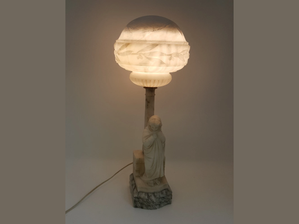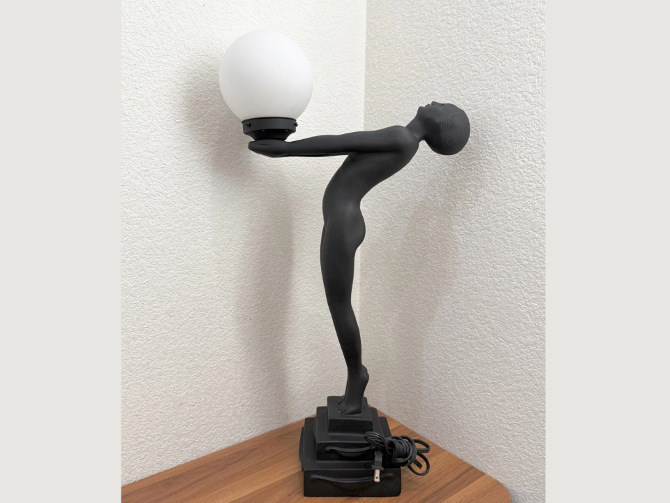 This lamp features a sculptural female figure holding a globe, embodying the elegance and sophistication of the Art Deco era. The lamp’s design combines geometric lines with organic forms, reflecting the period’s aesthetic. The figure’s pose adds a sense of grace and movement to the piece.