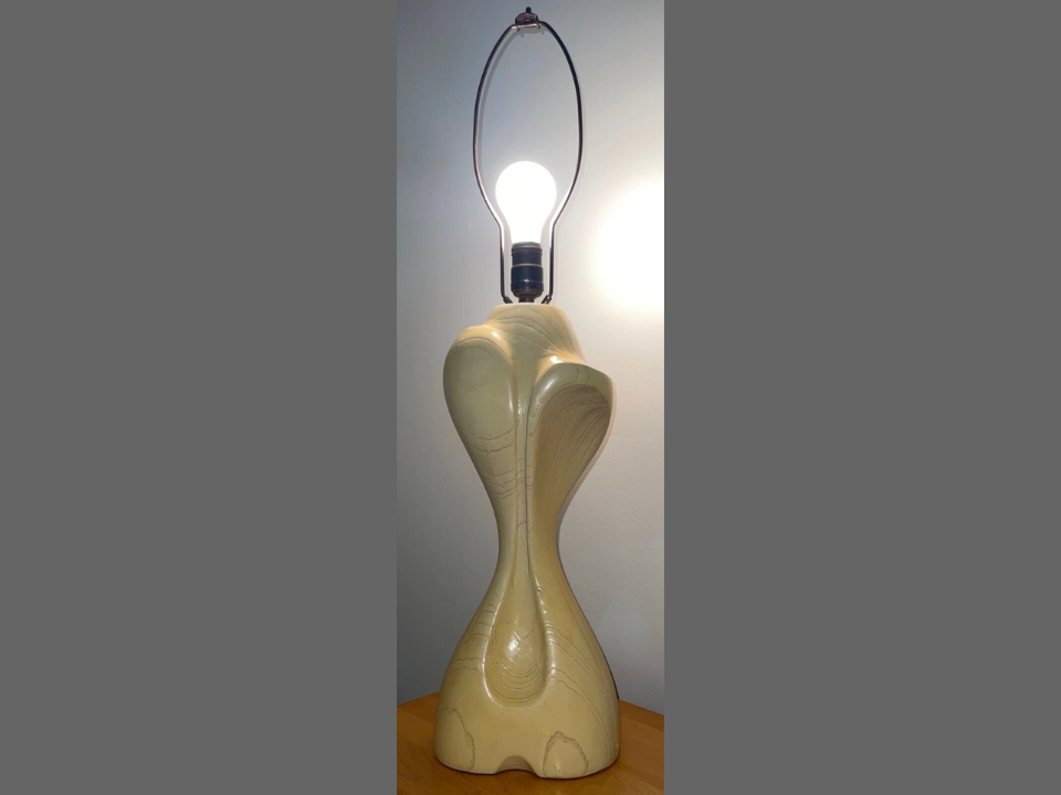 This lamp features a design that mimics the flowing forms of natural wood grain. The sculptural elements are hand-carved, showcasing the artisan’s skill in capturing the essence of organic shapes. The wood’s natural finish enhances its authenticity, making each piece unique.