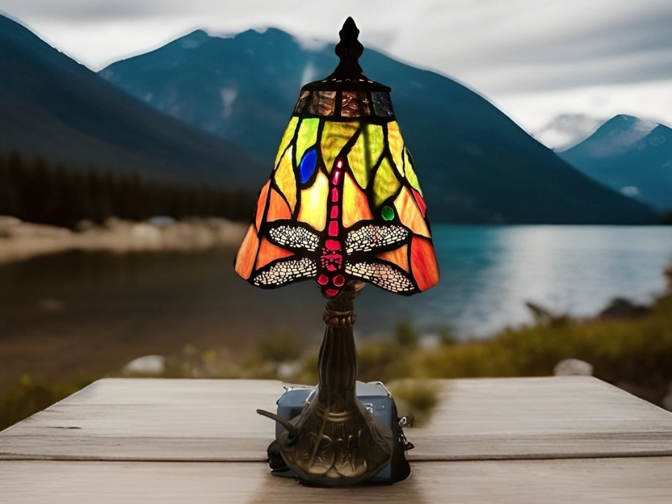This lamp features a dragonfly motif, with metal detailing and stained-glass-inspired wings that create a unique lighting effect. The design combines the elegance of the dragonfly with the geometric lines characteristic of Art Deco. While the wings may not provide substantial illumination, they add a decorative flair to the lamp.