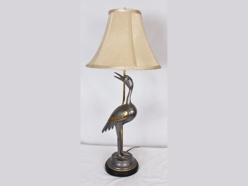 This vintage 1950s table lamp showcases a heron sculpture, capturing the elegance of the bird in mid-flight. The lamp’s sculptural detail reflects the Art Deco fascination with dynamic forms and natural subjects. The heron’s graceful pose adds a sense of movement and life to the piece.