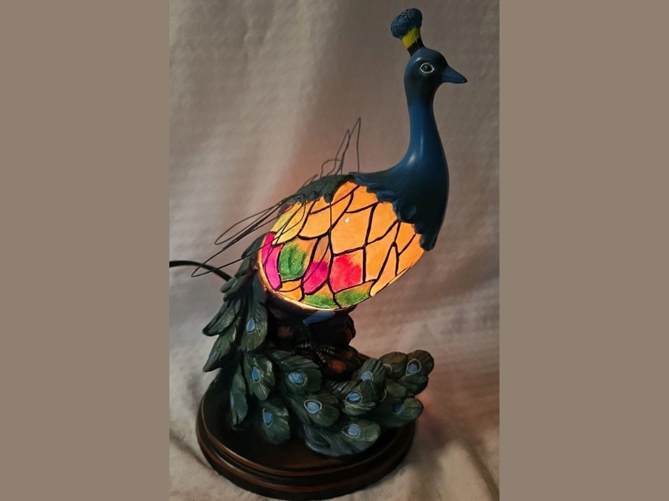 This lamp features a base shaped like a peacock’s feather, beautifully detailed with vibrant colors. The base captures the majestic elegance of the peacock, showcasing its intricate feather patterns in the sculptural form. The lamp’s warm light highlights the intricate design, creating a stunning visual display.