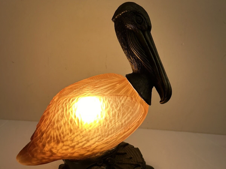 This rare antique lamp features a carved wood pelican sculpture, embodying the natural elegance of the bird. The lamp’s design captures the essence of the pelican’s form, bringing a touch of nature into the home. The carved details showcase the artisan’s skill and attention to detail.