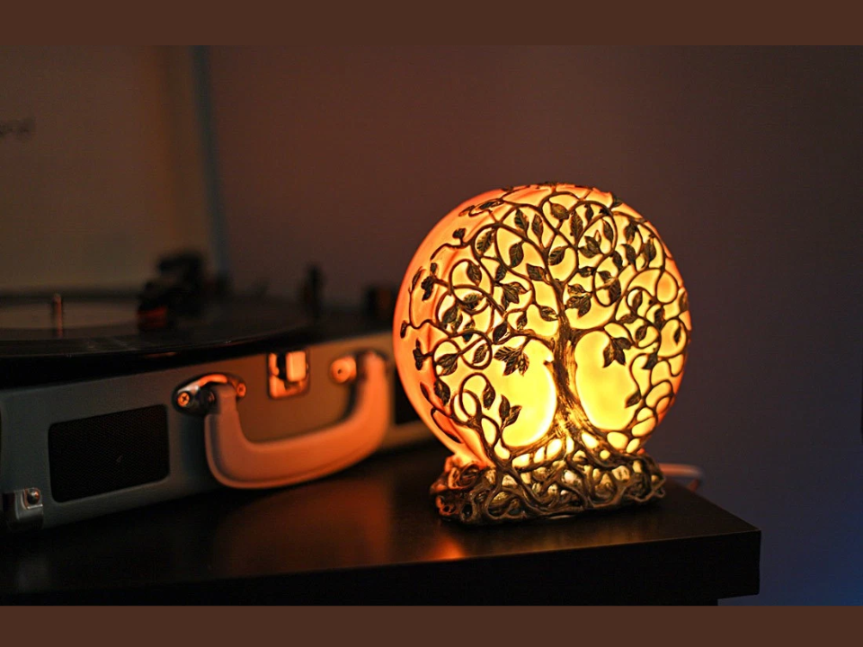 This striking lamp features a sculptural “Tree of Life” design, symbolizing growth and interconnectedness. The tree’s branches spread out across the lamp, with each limb intricately detailed to mimic nature’s organic patterns. The natural-inspired form adds depth and elegance to the piece.
