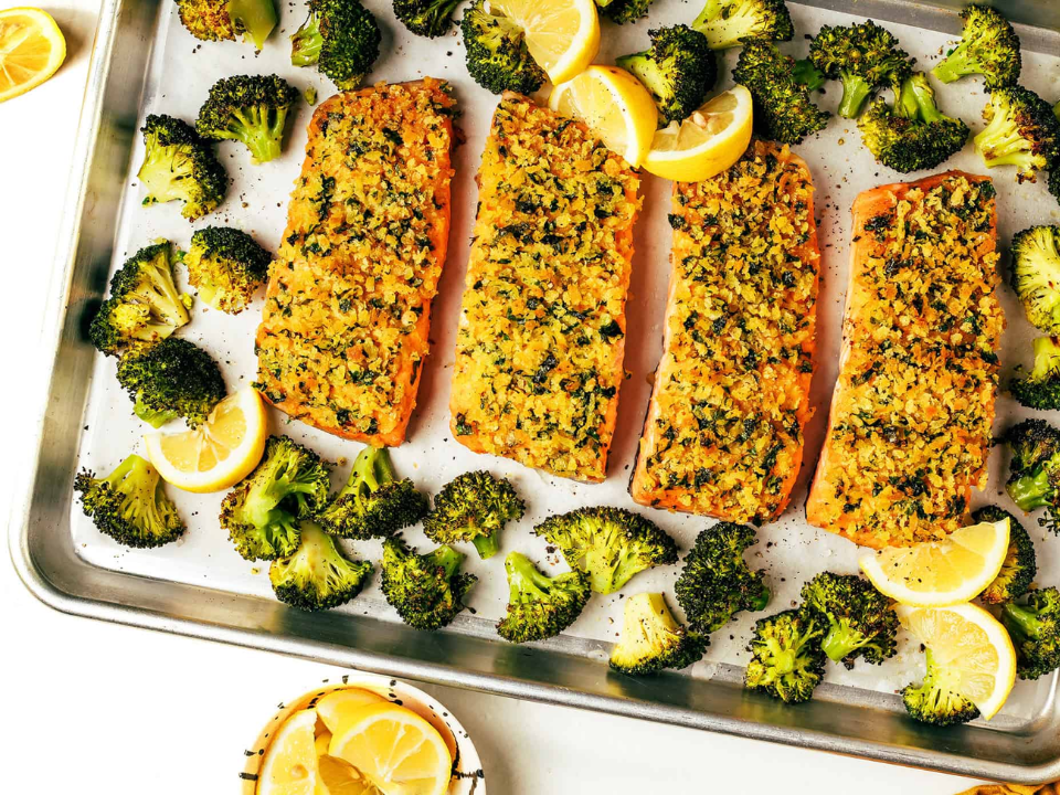 Arrange 4 salmon fillets and 4 cups broccoli florets on a lined sheet pan, then drizzle with 2 tablespoons melted butter and 1 tablespoon olive oil. Sprinkle on 3 minced garlic cloves, 1 teaspoon salt, one-half teaspoon black pepper, and the juice of 1 lemon, then rub the salmon lightly and toss the broccoli so everything is coated. Roast at 400 degrees Fahrenheit for 15 to 18 minutes until the salmon flakes easily and the broccoli is tender. Finish with lemon slices or a little chopped parsley if you like.