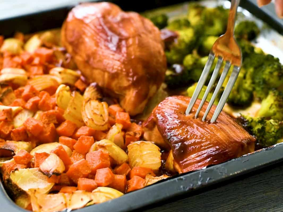 BBQ chicken and sweet potatoes work together well because the sauce adds rich flavor while the sweet potatoes roast into soft, caramelized bites. You can get this meal ready in about 15 minutes, and it cooks in roughly 35 minutes. A little red onion in the pan adds extra flavor without much extra work. This is a good choice when you want something hearty and familiar.