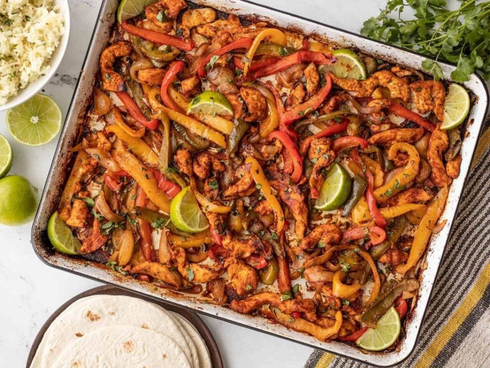 Slice 1 and one-half pounds of boneless chicken breast, 3 bell peppers, and 1 onion, then place them on a sheet pan with 2 tablespoons olive oil. Add 1 teaspoon chili powder, 1 teaspoon cumin, one-half teaspoon paprika, one-half teaspoon garlic powder, one-half teaspoon salt, and one-fourth teaspoon black pepper, then toss well so the seasoning coats everything. Bake at 425 degrees Fahrenheit for 20 to 25 minutes, stirring once halfway through. Serve with warm tortillas, lime wedges, and sour cream or salsa if desired.