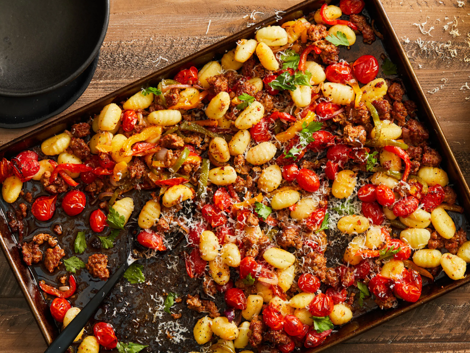 Combine 1 pound shelf-stable gnocchi, 12 ounces sliced sausage, 2 cups cherry tomatoes, and 1 sliced zucchini on a sheet pan. Drizzle with 2 tablespoons olive oil and season with 1 teaspoon Italian seasoning, one-half teaspoon salt, and one-fourth teaspoon black pepper, then toss well. Roast at 425 degrees Fahrenheit for 25 to 30 minutes, stirring once halfway through so the gnocchi browns more evenly. Top with 2 tablespoons of grated Parmesan or a few torn basil leaves before serving.