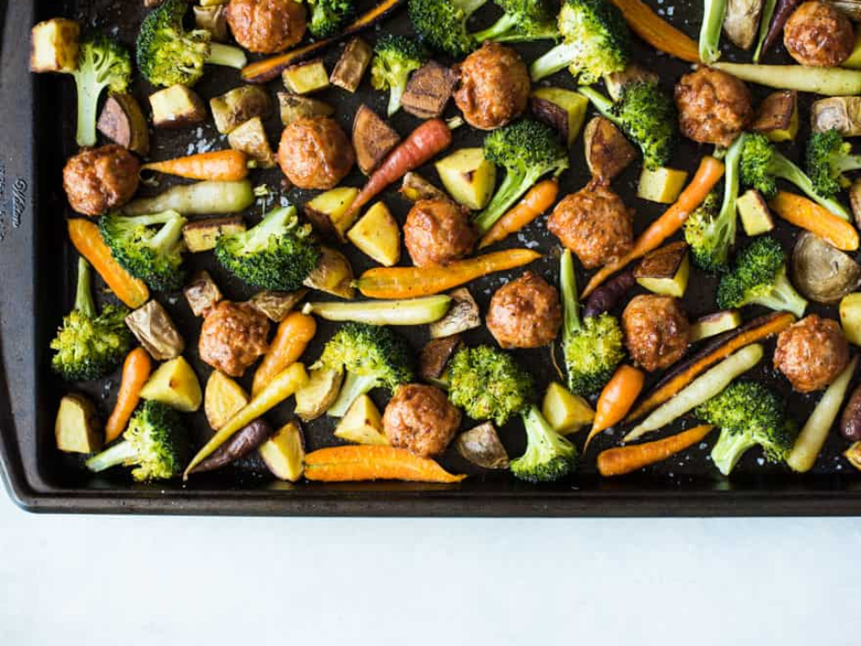 Meatballs and vegetables make a good one-pan meal because they roast well together and can be paired with rice, pasta, or bread. Prep time is about 20 minutes if you make the meatballs from scratch, and cooking usually takes 25 to 30 minutes. The vegetables pick up the savory drippings from the meatballs as they roast. This meal is also easy to change based on what vegetables you already have at home.