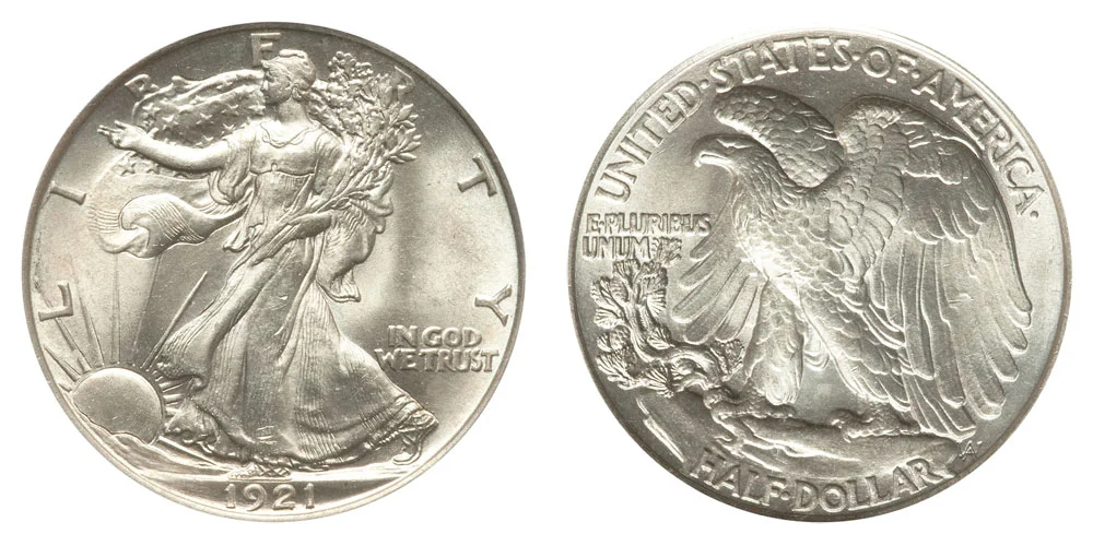 Introduced in 1916, this half dollar was produced until 1947. In typical circulated condition, it tends to range from $10 to $25. Well-kept examples in higher grades can command much more at auction. The graceful figure of Liberty on the obverse makes it a favorite among many collectors. With about 0.361 troy ounce of silver, it holds strong metal content.