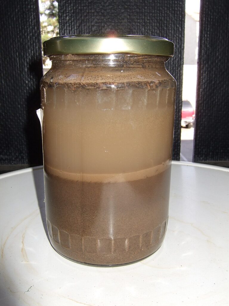 Fill a clear jar about one third full with dry soil from a few spots in your bed. Add water until it is almost full, then add a drop of dish soap and shake hard for a minute. Set it on a counter where it will not get bumped and watch the layers settle over the next day. Sand settles first, silt sits in the middle, and clay forms the finest layer near the top.