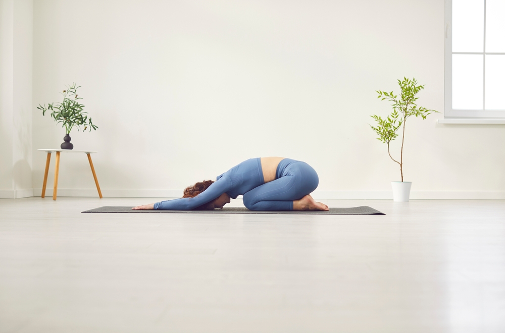 Begin on your hands and knees with your wrists directly under your shoulders and your knees under your hips. Slowly sit back onto your heels, extending your arms in front of you on the floor. Lower your forehead to the mat, allowing your body to relax into the stretch. Hold this position for 30 seconds to a minute, focusing on your breathing as you release any tension in your back, hips, and shoulders. If the stretch feels intense, use a cushion under your knees for added comfort.