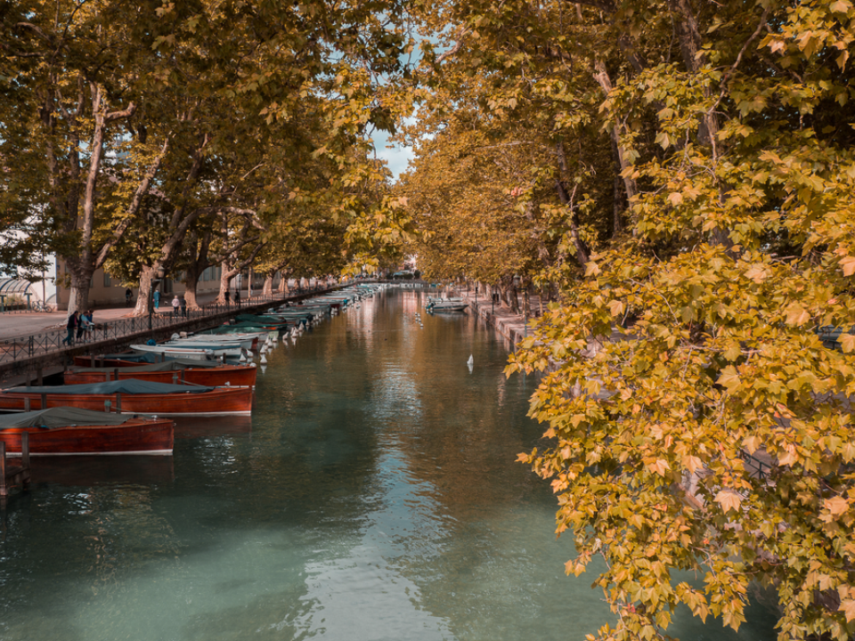 Annecy is a lakeside town often called the Venice of the Alps, and its charm grows in autumn. The clear lake reflects surrounding mountains covered in golden leaves. The canals of the old town are lined with trees that glow with seasonal color. Crisp air and soft light make the historic streets especially beautiful.