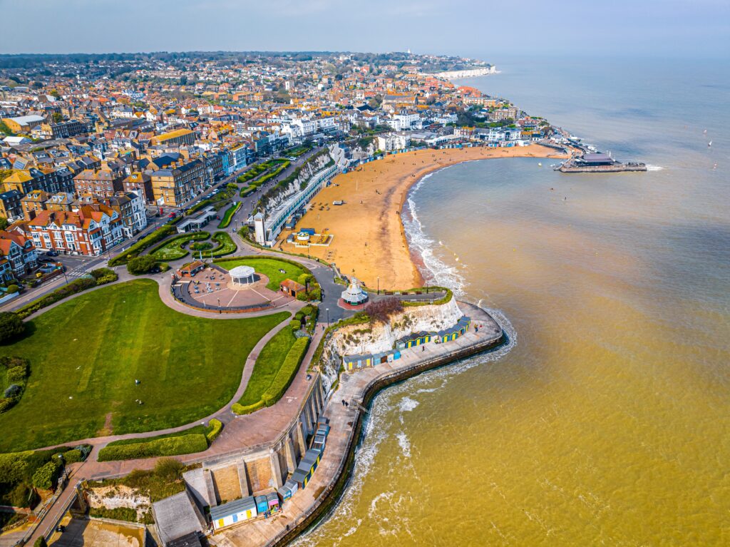 Broadstairs stays cheerful with its curved sandy beaches and tidy little coves. The chalk cliffs add bright color and reflect sunlight that makes the shore feel warm. Families enjoy Viking Bay because it has soft sand and calm water. The town feels friendly as you wander between shops, bakeries, and tea spots.