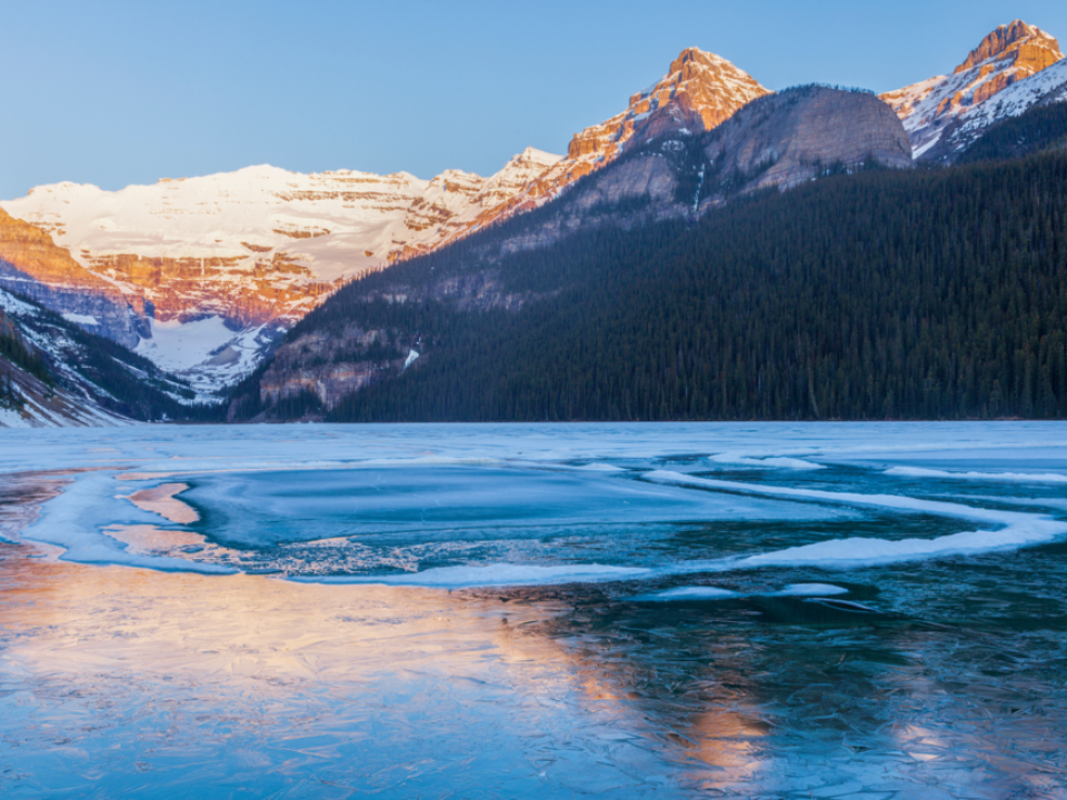 Winter in Lake Louise feels like stepping into a dream. The turquoise lake freezes into a smooth sheet of ice framed by snow-capped peaks. The grand Fairmont Chateau stands watch over the scene, its windows glowing warmly against the cold. The air feels crisp, and the sounds of skates slicing the ice echo softly across the valley.
