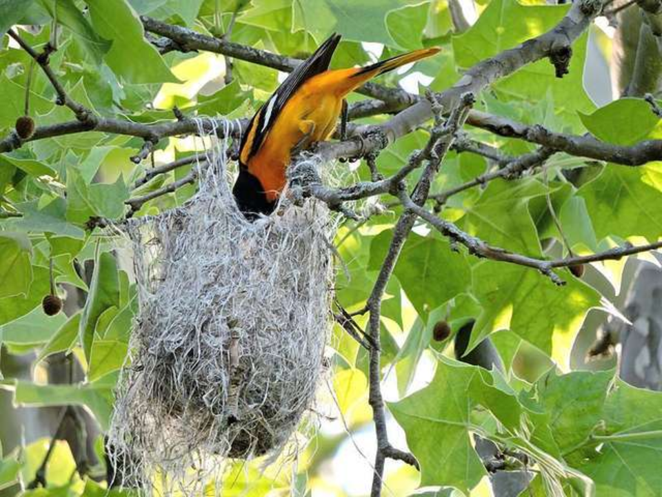 High on a thin outer branch, a Baltimore oriole nest can look like a hanging pouch swaying in the breeze. It is woven from plant fibers and other soft strands, which gives it a neat suspended shape, unlike most other nests. The design is striking even from a distance. Many people remember it as one of the most unusual nests of spring.