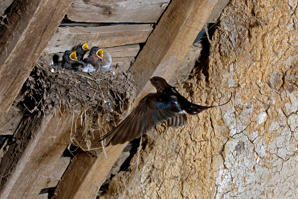 Even when the nest is over a doorway or near a work area, it should not be disturbed. Sweeping around it, knocking at the wall, or standing under it for long stretches can make the birds uneasy. Cleaning and repairs can wait until the nest is no longer in use. From a little farther back, you can still enjoy watching the swallows come and go.