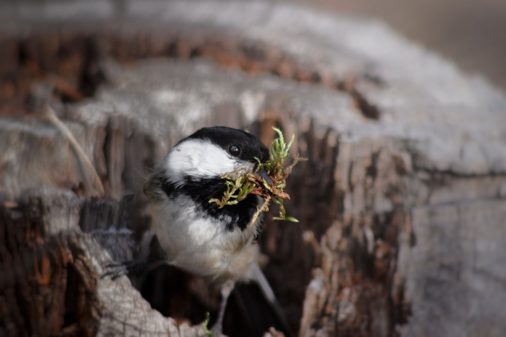 Inside a small cavity, a black-capped chickadee nest stays mostly hidden from view. The birds use tree holes or similar openings and line the nest with moss, fur, and other soft material. From the outside, you may see little more than a small dark opening in the bark. The parents flying back and forth often give it away.