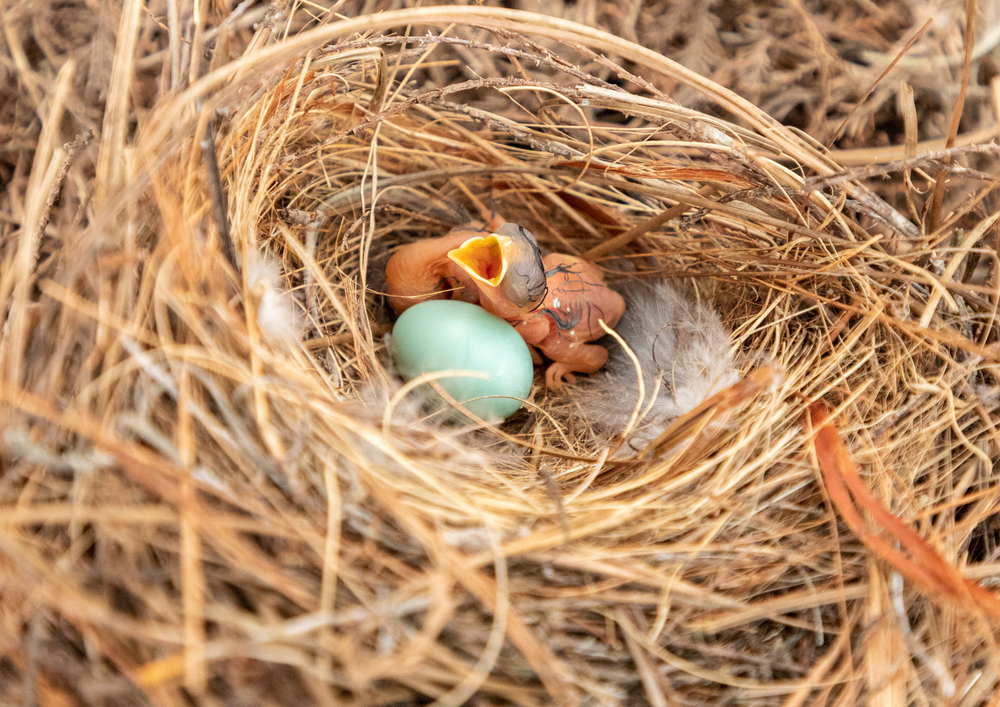 In open yards and fields, eastern bluebirds often raise their young inside nest boxes or tree cavities. Their nests are made from dry grasses and pine needles placed neatly in the protected space. You may first notice the adults carrying food rather than seeing the nest itself. That steady back-and-forth movement is usually the clue.