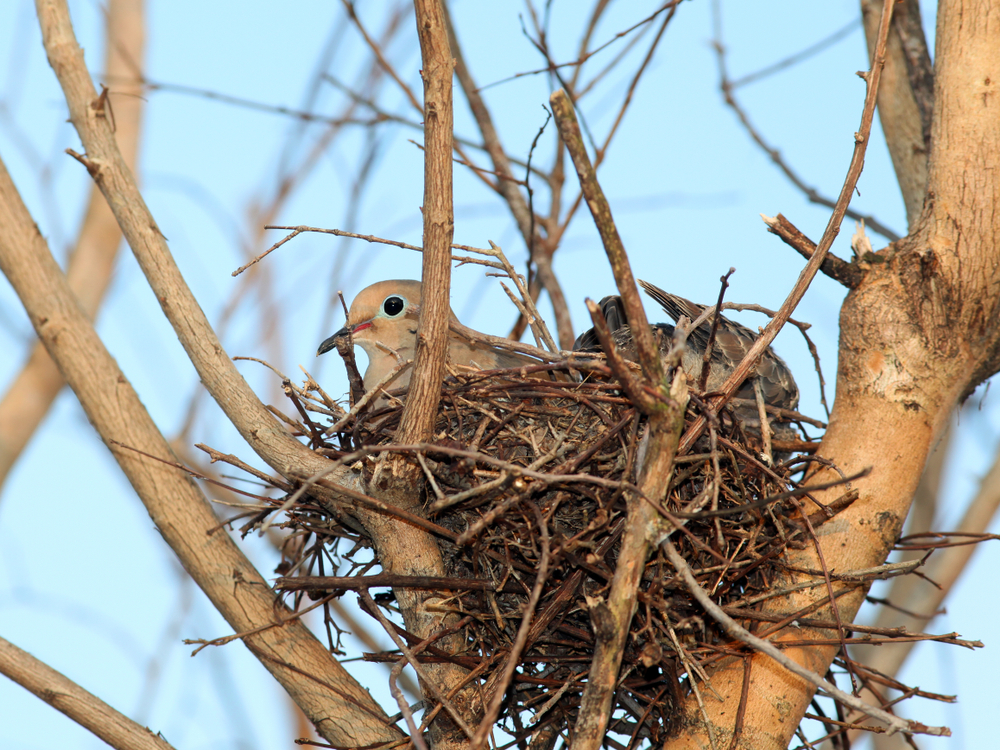 At first glance, a mourning dove nest can look almost too simple to hold together. It is usually made from a loose layer of thin twigs and may rest on a limb, beam, planter, or roof edge. The flat shape gives it a light and fragile appearance that stands out from deeper cup nests. That plain look is part of why it surprises so many people.