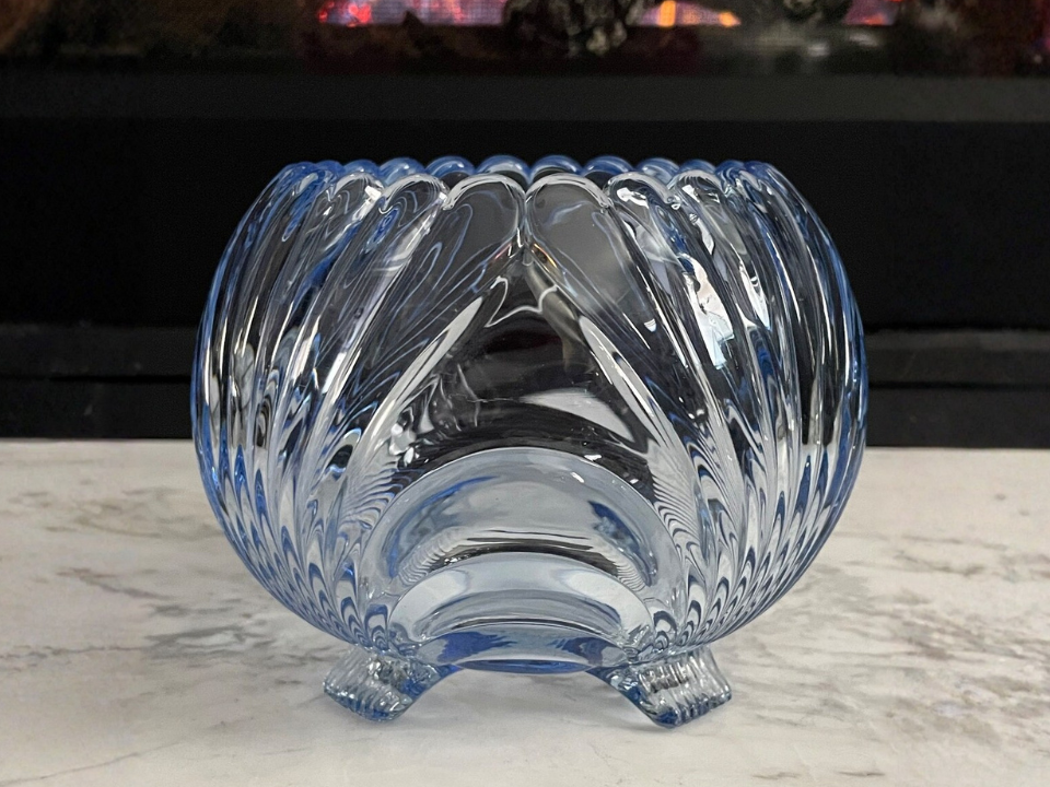 Blue, elegant glass has a cooler spring look, and Moonlight Blue Caprice from Cambridge does that very well. This footed rose bowl is made of blue, elegant glass with the rippled Caprice design. Collectors like the flowing lines and the gentle color, which keeps it decorative without feeling too heavy. A clean example often sells for about $50 to $85.