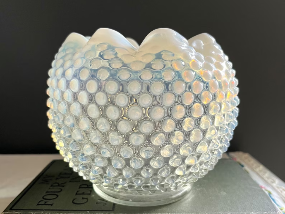 White opalescent glass can look fresh and bright in spring, and Fenton’s hobnail rose bowl shows why. It is made of opalescent glass with a raised hobnail texture and a softly ruffled rim. Buyers like the mix of texture, light color, and easy display appeal. Many standard examples bring about $45 to $50.