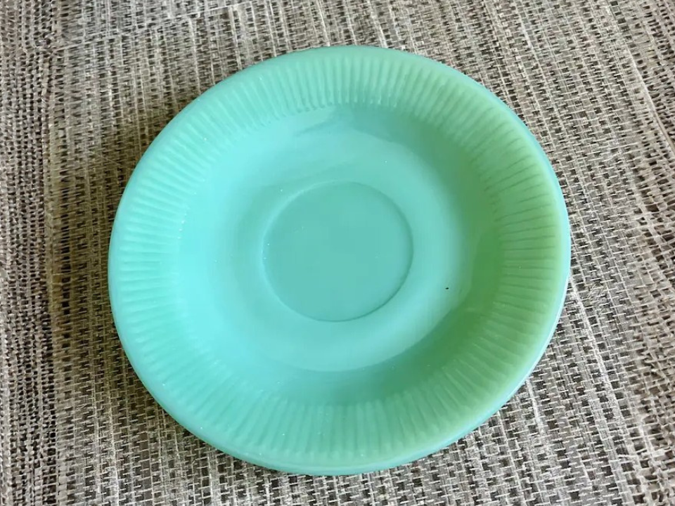 Jadeite keeps showing up on wish lists, and the Jane Ray dinner plate is one of the best-known pieces. It is made of pressed jadite glass and has the ribbed edge that many collectors recognize right away. Buyers like it because the milky green color feels fresh and still works in everyday kitchens. A single plate often costs around $20 to $35, depending on wear.