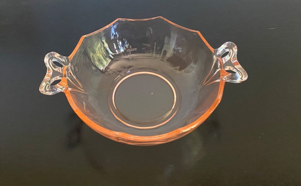 One reason buyers like it is that the bowl still feels useful today. It works nicely for fruit, desserts, or a simple display beside other pink pieces. Handle joins and rim edges should be checked for small damage. A clean example can add a lot of charm without costing too much.