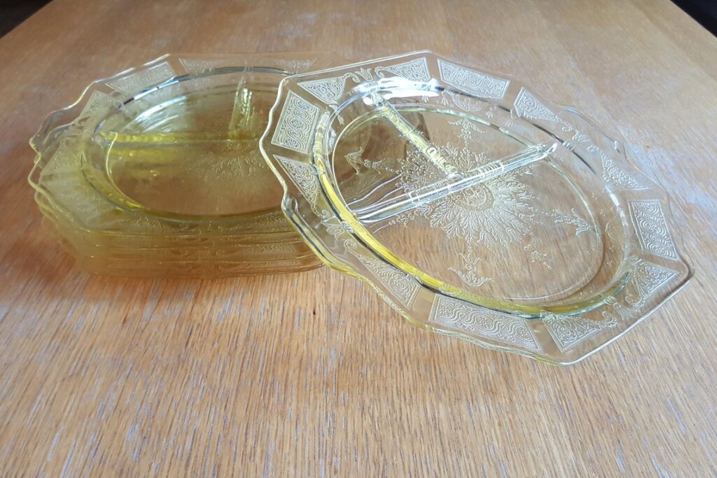 A yellow grill plate from the Princess line brings a sunny touch that many spring collectors enjoy. This piece is made of pressed yellow Depression glass and is often listed as topaz yellow. The divided shape adds old kitchen charm, which helps it stand out from plain plates. Most single plates sell in the $5 to $15 range.