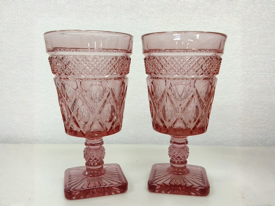 Deeper pink stemware has a richer look than many flat plates or bowls, and Cape Cod goblets show that clearly. These are made of pressed pink glass with a textured geometric pattern and a stemmed shape. People like them because they feel formal, colorful, and easy to display. A single goblet often sells for about $24 to $50.