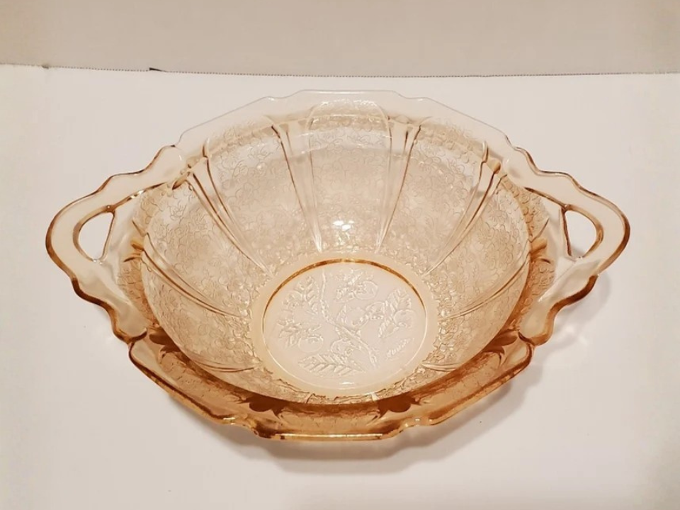 Soft floral patterns often feel right at home in spring collections, and this Jeannette bowl is a good example. It is made of pressed pink Depression glass with the Cherry Blossom pattern worked into the surface. People like it for the light floral detail and the gentle shape of the handles. A fair market range for a clean piece is usually about $25 to $55.