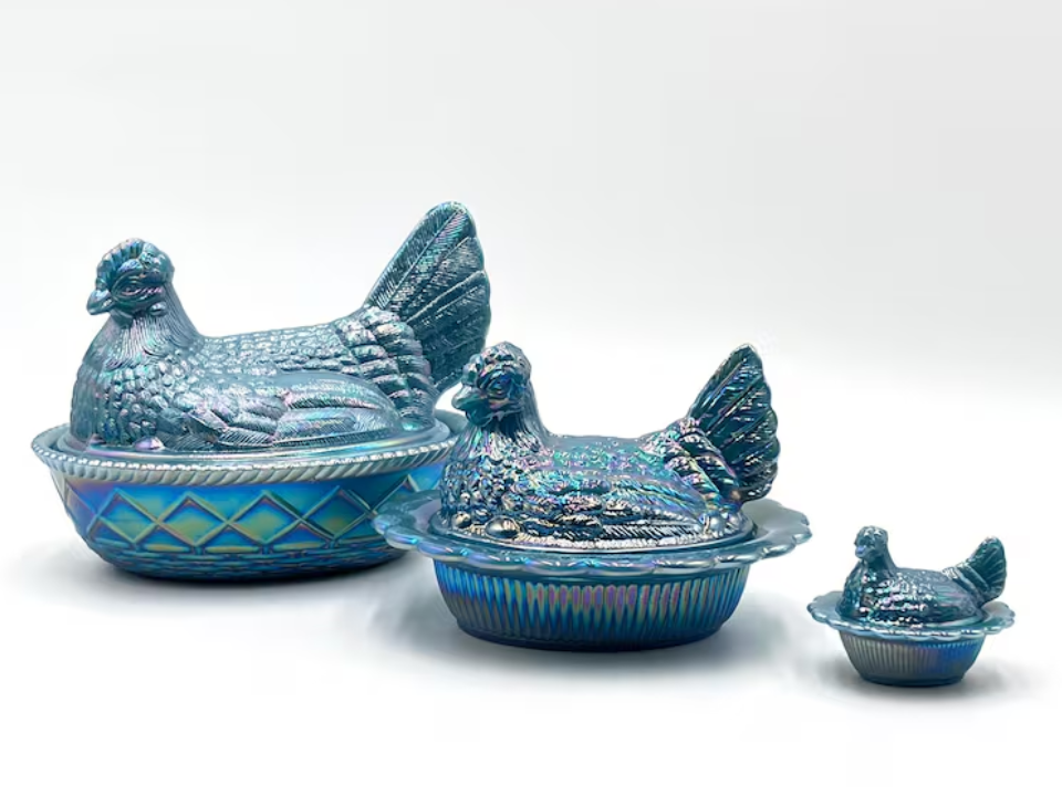 Animal-shaped glass has a fun side, and a blue hen on a nest from Mosser often gets noticed quickly. It is made of art glass and is sold in glossy or carnival-finish blue versions, depending on the piece. Collectors like the lively color and the long-running appeal of the hen form. Many blue examples fall around $80 to $90, with mini versions selling for less.