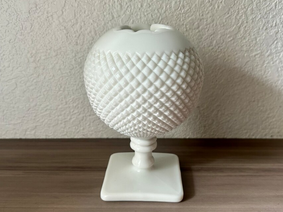 Milk glass often gives a collection a cleaner look, and this Westmoreland ivy ball vase does that well. It is made of milk glass with the English Hobnail pattern over the rounded body. People like it because it is small, useful, and easy to place in many rooms. A common market range is around $30 to $40.