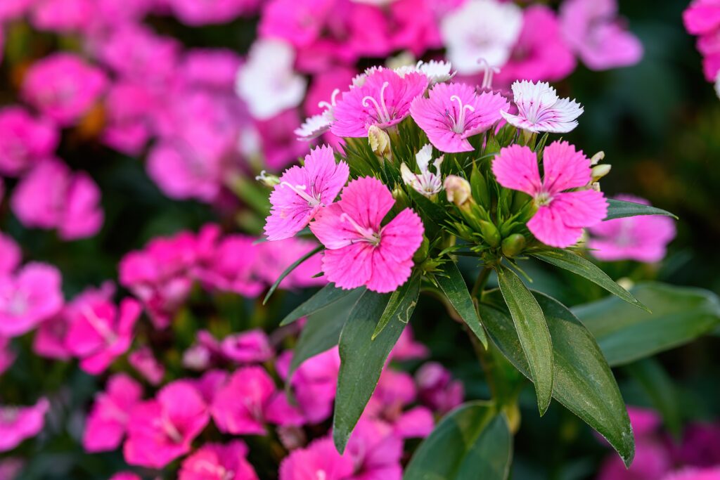 Dianthus stays low and tidy, with narrow blue green leaves that look like a neat little tuft. In spring, the flowers pop up in bright pinks, reds, or whites, and many have a light clove-like scent. It likes sun and well draining soil, so it is a good pick for edges, rock gardens, and containers. Because it stays compact, it helps borders look finished instead of shaggy.