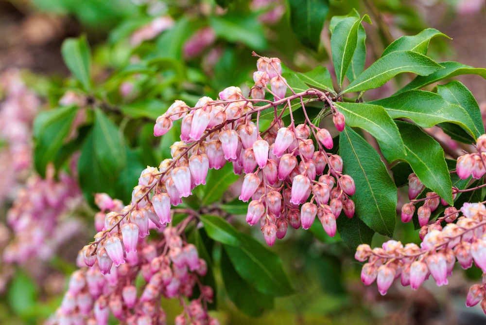 Japanese andromeda is native to Japan, eastern China, and Taiwan, and it has a very polished look in the garden. Its pink flower clusters hang down like little bells, which gives the shrub a graceful spring display. Young leaves often come in bronze or red shades before turning dark green, so the plant stays attractive after blooming ends. That mix of flowers and leaf color makes it easy to notice from a distance.