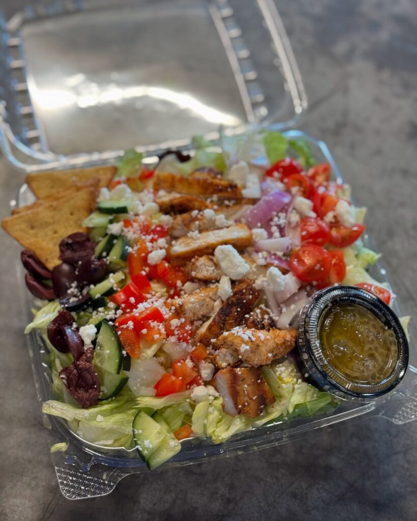 This one has the bright, salty flavors of a Greek salad, but the grilled chicken and crunchy pita chips make it feel like a real meal. The mix of cucumber, tomato, olives, and feta stays crisp, even after it sits for a bit. It is great for warm days when you still want something that keeps you satisfied.