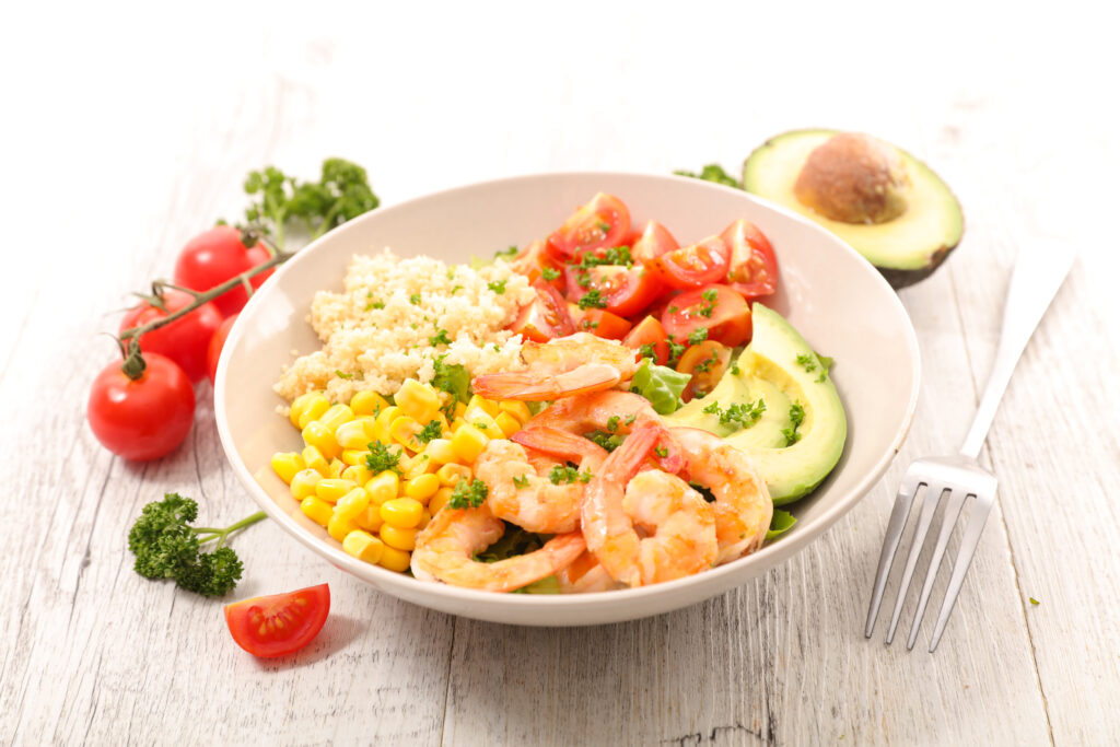 You will need 1 pound cooked shrimp peeled and deveined, 6 cups chopped romaine or mixed greens, 1 avocado diced, 1 cup corn kernels cooked or thawed if frozen, 1 cup cherry tomatoes halved, 1 4 cup chopped red onion, 1 4 cup chopped cilantro, 3 tablespoons olive oil, 2 tablespoons lime juice, 1 teaspoon honey, 1 4 teaspoon salt, and black pepper to taste.