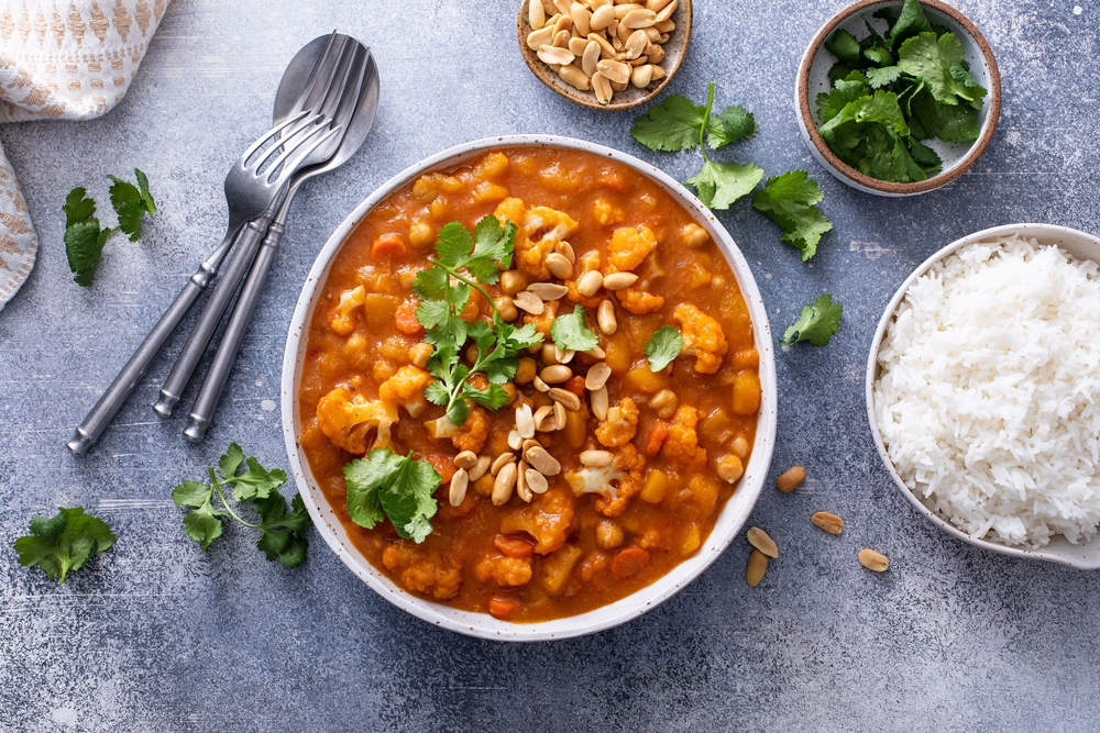 You will need 2 cups of cubed squash, 1 can of chickpeas, 1 onion, 2 cloves of garlic, 1 can of diced tomatoes, and vegetable broth. Add cumin, paprika, salt, pepper to taste, and peanuts (optional). Fresh cilantro adds a fresh touch to the finished dish.
